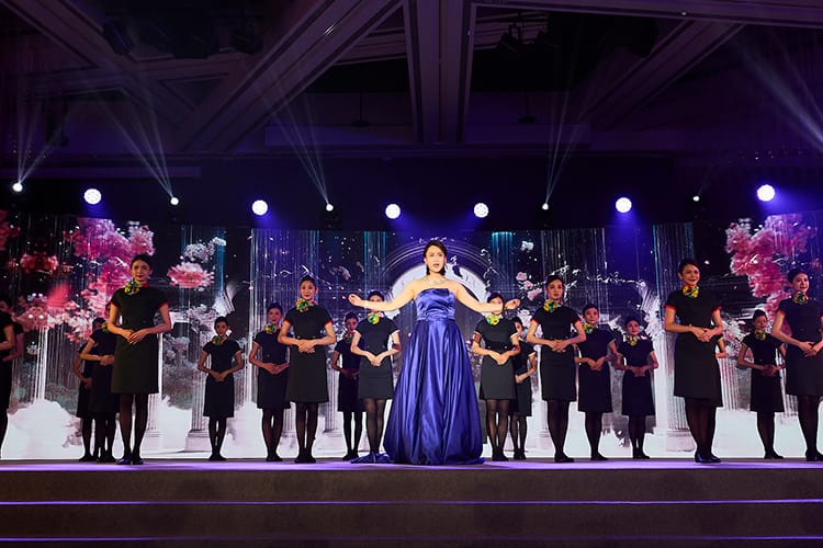 長榮航空BizFam發表會邀請高音女伶Kiki至現場演唱,搭配沉浸式舞台,以美妙樂聲交織出最美的天際線。