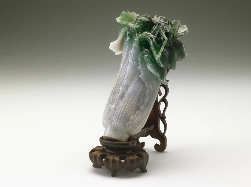 白菜諧音百財,是傳統飾品喜用元素。翠玉白菜論材質、雕工皆非一等一,但體現匠師量材就質精神,將材質的不完滿,轉為匠心獨具。白菜的親切可愛,易取得觀者共鳴,就是其魅力所在。正因其不貴重又親民,故宮開放時就選為「齋宮玉器陳列室」的展件。原本此品有白菜、靈芝、琺瑯花盆共3配件。館員以民眾視角思考,白菜與靈芝本不會一同生長,也無人會把白菜植栽於花盆之中,終只挑選白菜展出,其他物件入庫。當翠玉白菜一展出,獲佳評如潮,成為遊故宮者津津樂道之物。之後抗戰、遷台,翠玉白菜就鮮少展出,直到民國46年故宮在台北復院展出,因翠玉白菜的熱門,眾人自然好奇其身世,故宮因此著手為翠玉白菜譜寫身分。