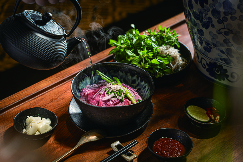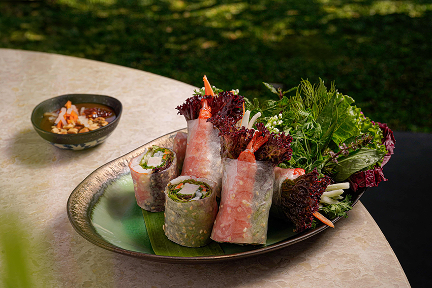 菜色亮點包括選用藍蟹肉、虎蝦、木耳與豆芽的酥炸海鮮春捲,外皮金黃酥脆,搭配酸甜魚露醬香氣四溢;西貢生春捲以米紙包裹虎蝦、豬五花、米線與新鮮香草,冰涼上桌佐魚露、花生醬或豆豉醬享用,清爽開胃。河內烤肉米線結合烤豬肉丸、米線與醃漬蔬菜,風味清新;河內李旺魚餅則以薑黃醃製白身魚搭配蒔蘿炭烤,香氣濃郁。招牌和牛河粉使用牛骨、牛筋與香料熬煮的清澈高湯,搭配和牛肋眼與 Q 彈河粉,齒頰留香讓人回味無窮。