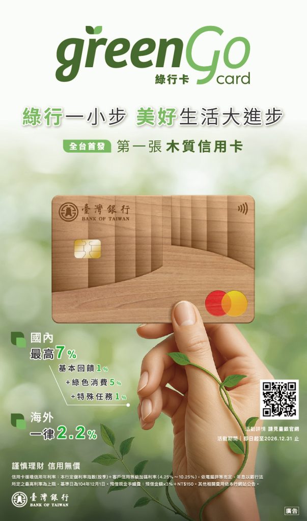 此外,綠行卡將消費與公益緊密結合,臺灣銀行選定15家符合聯合國永續發展目標(SDGs)的公益機構,涵蓋環境保護、教育扶助、弱勢關懷與社會創新等面向,持卡人可將每筆消費轉化為對公益的支持,並額外享1%回饋。臺灣銀行同時加入萬事達卡「無價星球聯盟」(Priceless Planet Coalition),推動森林復育與生態修復,並承諾在綠行卡上市首年種植17,250棵樹木,以具體行動參與全球氣候行動。
