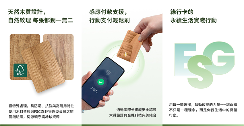 臺灣銀行推出全台首張木質信用卡「綠行卡」,卡體採用通過森林管理委員會(FSC)認證的木質材料,製程碳排放量遠低於傳統塑膠卡。天然木紋搭配簡約設計,融合工藝美學與永續理念,在兼具美感的同時,有效減少碳足跡,為信用卡市場帶來全新體驗,展現金融服務與環境責任結合的新樣貌。