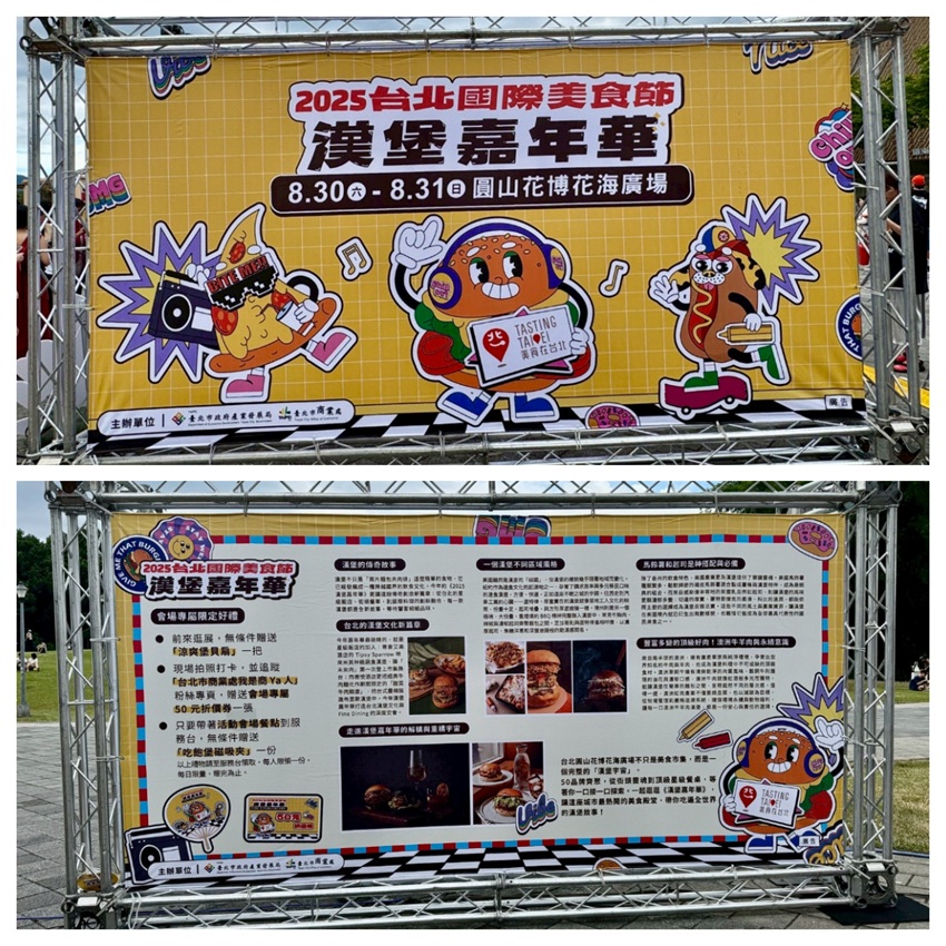 為推廣本市多元豐富的餐飲美食底蘊與美味,臺北市商業處以「2025台北 國際美食節」為主題推出雙主打系列活動,首波於8月30日至8月31日在圓山花 博花海廣場舉辦「漢堡嘉年華」市集,匯聚了50間超人氣知名漢堡品牌店家, 如臺北漢堡名店屠夫漢堡推出脆片藍莓牛肉堡,展現甜鹹口味的完美交織、全 美最大的連鎖牛排 Texas Roadhouse 德州鮮切牛排,將人氣漢堡美國大聯盟帶到 活動現場及首次到台北擴店的超人氣燒肉名店老井極上燒肉,融合了台灣小吃 技法,所製作成的日式漢堡排等熱門商品;今年更首度與5星級飯店合作, 如台北君悅酒店及台北寒舍艾美酒店,都在本次「漢堡嘉年華」活動現場盡數 呈現,就是要讓市民朋友充分享受這場夏日味蕾饗宴!