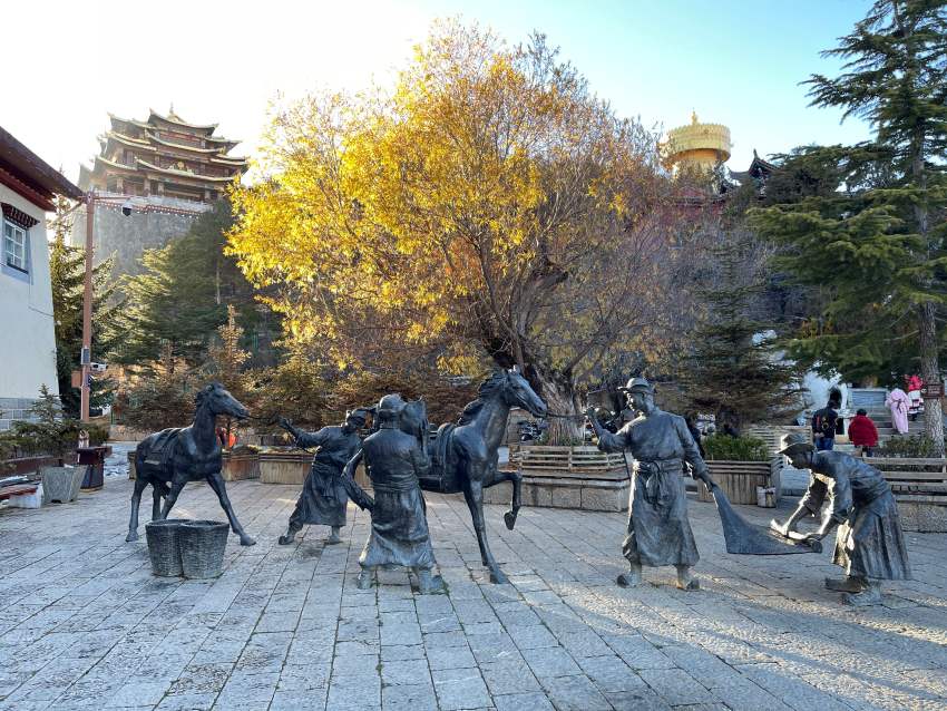 四方街廣場是中心點,周邊林立各種商店和餐廳,傍晚時分會有當地人在此載歌載舞,並邀請遊客同歡。不過,可能有人會覺得這座古城太新,那是因為2014年一位來此住宿的遊客,外出時沒有關掉電器電源,結果不僅燒了該棟民宿,也讓城內大量藏民居遭殃,現在樣貌是後來改建的。城內另一個讓遊客感興趣的當屬世界最大的轉經筒,位於龜山公園內,約有4層樓高的轉經筒,其純銅鍍金的筒壁外有浮雕的文殊、普賢、觀音、地藏等四大菩薩和佛家八寶圖,每個遊客必定會加入轉經隊伍陣容中,體驗祈福的感動和樂趣。