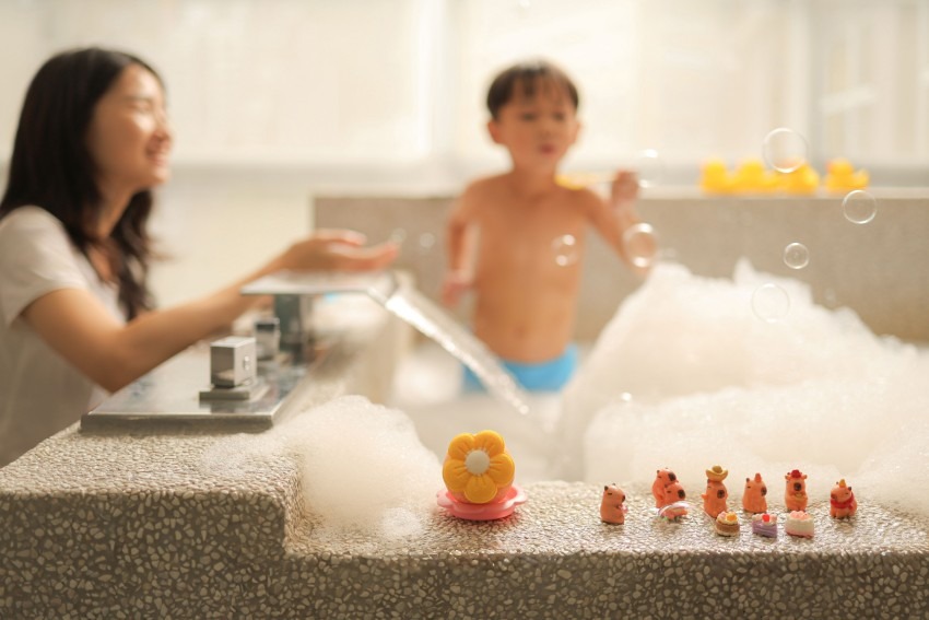 呼應「泡泡」主題,館內戶外露天風呂打造期間限定的 泡泡樂園。黃色小鴨池畔點綴繽紛泡泡裝置與漂浮泡泡球,在光影下閃耀迷人,成為親子拍照留念的夢幻場景。