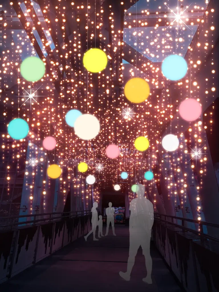 《魔幻泡泡塔》是一座可穿越、可停留、可參與的沉浸式燈光劇場。設計以多層結構為基礎,結合燈光律動、泡泡特效與空間營造,將高架下的廣場轉化為宛如遊樂園般的奇幻舞臺。白天,它是一座絢爛的塔樓;夜晚,則成為會隨音樂呼吸的光影雕塑,吸引人群駐足並融入這場城市的定時演出。