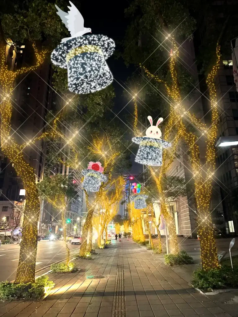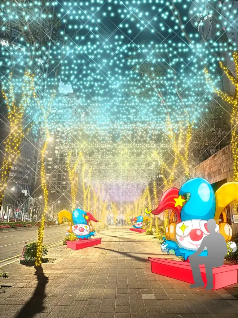 沿著閃爍燈飾的路樹間,一座座繽紛可愛的馬戲團大象驚喜登場,色彩亮眼、氣勢十足!大象高舉鼻子,頂著一顆會旋轉的彩球,為整體增添動態趣味,讓靜止的街道瞬間活了起來,吸引民眾駐足拍照。