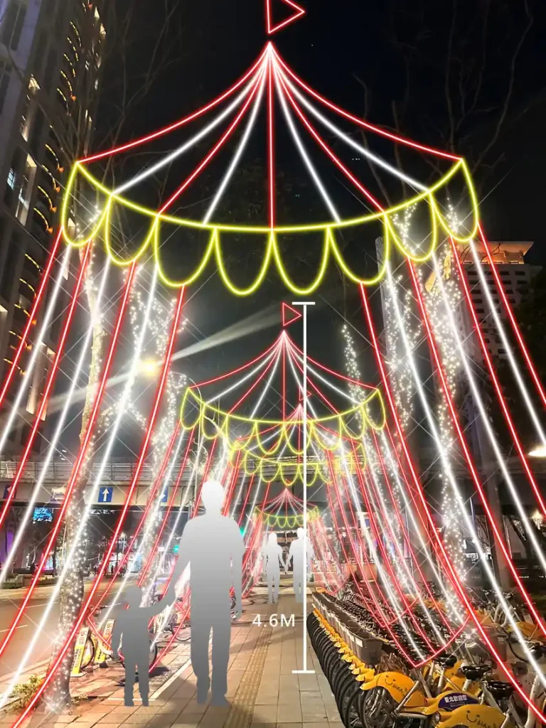 燈條描繪出經典帳篷輪廓,引領民眾踏入一場閃耀歡樂的冬日嘉年華。光影交織下,每一步都像走進童話馬戲世界,感受節慶的溫暖與魔幻魅力。