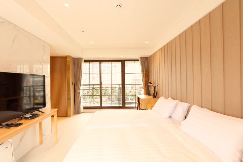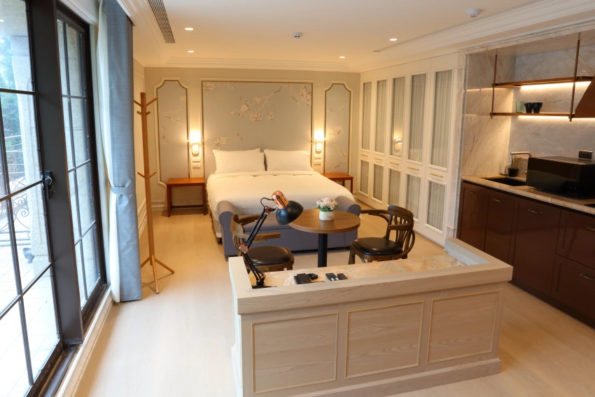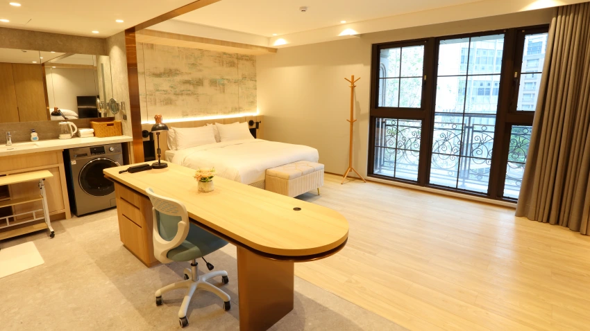 每間客房皆採標準的一房一廳一衛寬敞尺度,並貼心配置了獨立的客廳及廚房設備。這種設計哲學體現了「家的溫度」,讓長住的住戶即便遠離家鄉,依然能享有私密與愜意的居住空間。這種豪宅配備的住宿體驗,在南京復興捷運站周邊極為罕見。