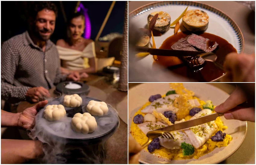 當靛藍夜幕籠罩天穹,「香料之路之旅」晚宴則帶領賓客進行一場橫越時空的夜間味覺遠行。這場六道菜的饗宴,精心設計的菜色靈感源於古老商道上的珍貴香料。從以哈里薩辣醬提味的黃鰭鮪魚、烤大蝦,到主菜的椰棗糖漿牛里脊或藏紅花地中海鱸魚,每一口都完美詮釋了中東風味的細膩與優雅,在星空下寫下專屬旅人的嶄新篇章。