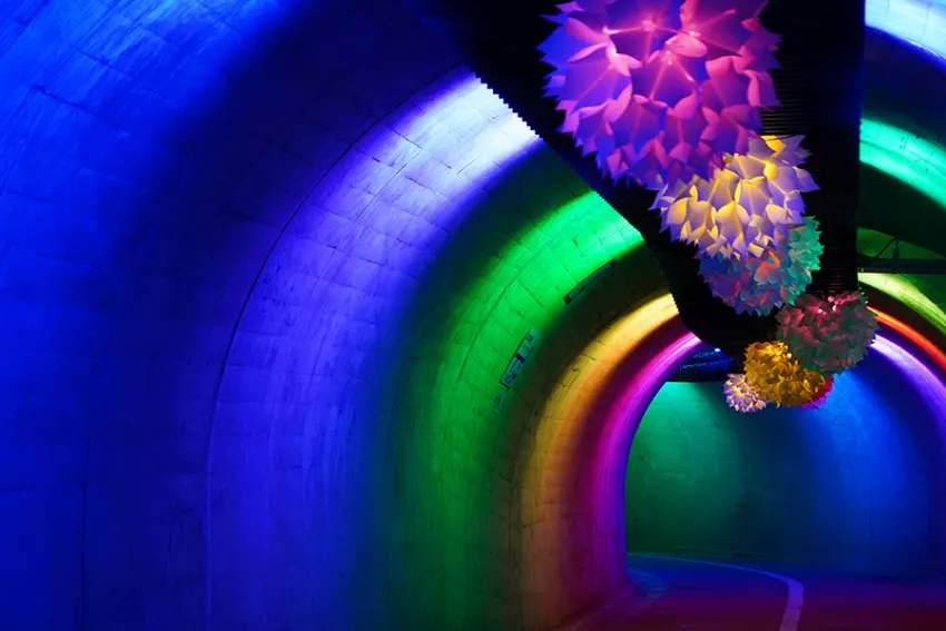 這是一場關於自然與光影的對話。作為茨城縣大子町的冬季風物詩,遊客首先會穿越一條「光之隧道」。隧道入口映照著秋色,隨著腳步深入,燈光逐漸轉為冷冽的冬景,彷彿穿越了季節。 穿過隧道後,映入眼簾的是被柔和光芒包圍的袋田瀑布。這座日本三名瀑在夜間展現出神秘的姿態,水流如絲綢般在光中飛舞。途中還設有戀人聖地紀念碑,是情侶約會的浪漫首選。
