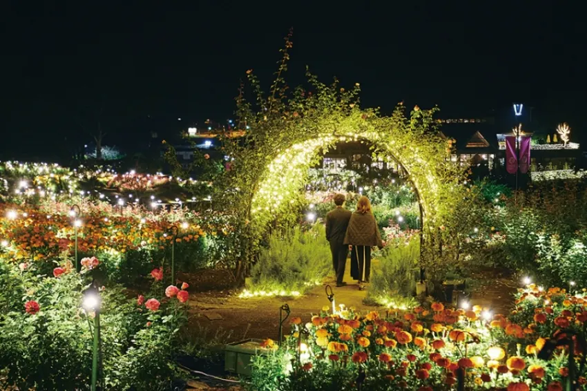 這是一場獻給感官的魔法時間。茨城花卉公園利用柔和燈光,照亮800個品種的秋季玫瑰與2萬朵萬壽菊。在香氛玫瑰區,您可以漫步在「月光」下,欣賞隨風飄舞的2000片「風之花瓣」。這是一種內斂而優雅的賞花體驗,讓人忘卻時間。